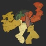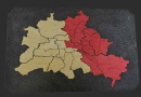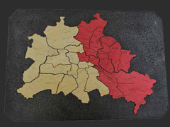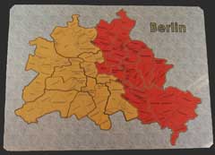 Vielen ‚Wessis’, die vor 30 Jahren schon erwachsen waren, erschien der ‚Osten’ als undefinierte graue Masse. Diesem Empfinden entsprechend ist dieses Puzzle gestaltet, bei dem die jetzt aktuellen Ortsteile des ‚Goldenen Westens’ frontseitig auf die 8 westlichen Bezirksteile gedruckt sind und von den 6 Ostbezirken lediglich noch der Bezirk Mitte spezifiziert ist. |