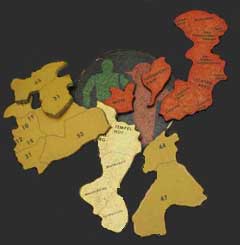 Bei dem anderen Set-Puzzle sind die goldenen ‚West-Bezirke’ mit den aktuellen Ortsteilen beschriftet, und der ‚Ost-Teil’ verschwimmt in einer grauen Masse. Beide Puzzle sind rückseitig beschriftet. So können beide Puzzle je nach Belieben zusammengesetzt werden. |