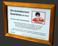 Bis zu 30 Blatt im A4-Format fasst dieser Wandrahmen, der hier in der ‚Erwachsenen-Version’ mit echtholzfurniertem Rahmen vorgestellt ist. So können Dokumente, Bilder, Kinderzeichnungen usw. gezeigt und aufbewahrt werden. Das spezielle Einschubsystem der integrierten Wandaufhängung ermöglicht sowohl hoch- als auch querformatige Anbringung. Für einen einfachen Bildwechsel ist eine Frontfolie verwendet, die auf Wunsch auch gegen reflexionsfreies Glas getauscht werden kann. |