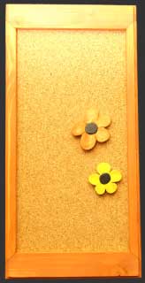 Auch diese in einem dezent orange-farbenen Ton gebeizte Pinwand ist für die zusätzliche Nutzng als Würfel-Tablett optimiert. Die in den Vollholz-Rahmen integrierte bündig integrierte Aufhängung ermöglicht die Nutzung als Pinwand sowohl im Hoch- als auch im Querformat. Die beiden als Blütenköpfe ausgearbeiteten Pin-Stecker sind aus heimischem Weidenholz handgeschnitzt. Für den Oberflächenschutz wurde auch hier ein Klarwachs auf biologischer Basis gewählt. |