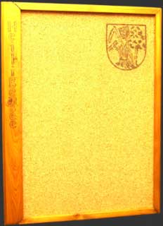 Entsprechend ihrem Fertigungsort und ausschließlich für ‚Lokal-Patrioten’ entworfen zeigt diese Pinwand das Bezirkswappen von Heiligensee als brandgezeichnete Skizze. Auch die Bezeichnung des Reinickendorfer Ortsteiles ist in Handarbeit in den breiteren Rahmenteil gebrannt. Der Holz-Rahmen mit integrierter Aufhängung und auch die Korkplatte sind mit biologischem Klarwachs geschützt. |