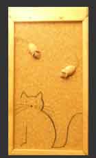 Der asymetrische Holzrahmen dieser Pinwand hat seine Aufhängung bündig integriert, so dass es auch keine Kratzer in der Tischplatte geben wird, wenn man die Pinwand als Würfelbrett zweckentfremdet. Das Katzenmotiv ist in die eingelassene Korkplatte gebrannt, die Pinstecker sind aus Vollholz gedrechselt und, wie auch die gesamte Pinwand, mit biologischem Klarwachs gegen Feuchtigkeit und Verschmutzungen geschützt. |