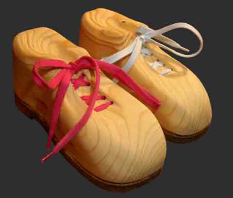 Manchmal ist es so, dass zwei Menschen unbedingt zur gleichen Zeit das Gleiche üben wollen. Hierfür gibt es auch ein Paar Schuhe, d. h. einen linken und einen rechten Turnschuh. Die Schuhe sind wie der vorher beschriebene aus einem Stück Fichten-Vollholz geschnitzt, haben jeweils 6 Paar Senkellöcher und eine mit Dekorwachs gefärbte Sohle. Die Oberseite ist naturbelassen mit Klarwachs behandelt, wodurch die natürliche Haptik des Holzes erhalten bleibt. |