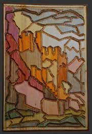 Das auf dieser Seite oben vergrössert dargestellte Puzzlebild einer Ruine umfasst 51 plastisch gearbeitete und aquarellierte Teile. Nicht nur die Motivwahl, auch der Schwierigkeitsgrad ist auf Erwachsene ausgerichtet (die sich aber durchaus von Kindern bei der Puzzlearbeit helfen lassen können). Die schmale Rahmenkonstruktion liess hier eine zweckmäßige Wandaufhängung nicht zu. Es ist optional eine Staffelei für die Aufstellung erhältlich. |