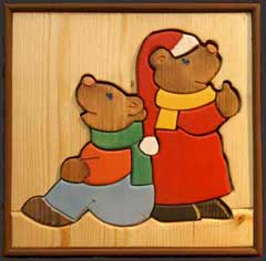 Bei diesem handlichen 10teiligen Puzzlebild wurde auf eine Wandaufhängung verzichtet, da es von der Teilegröße für Kinder ab 2 Jahren konzipiert ist und diesen der selbstständige Zugang zu dem Spielpuzzle ermöglicht bleiben sollte. Hier ist die Rahmenplatte vertieft gearbeitet, wodurch die klar definierbaren Partien der Bärenbrüder plastisch hervorstehen und leichter zu handhaben sind. Alle Teile dieses Puzzles sind mit Bio-Material gefinisht. |