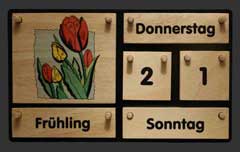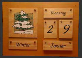 Sehr aufwändig wurde bei diesem Kalender nicht nur die Beschriftung in die Holzplättchen aus Kiefer-Schichtplatte gefräst und nachcoloriert. Auch alle bildgebenden Linien sind in das Material eingefräst und die vier jahreszeitlichen Motive sind deckend handgezeichnet. Alle Elemente sind zusätzlich mit mehrschichtigem, für Kinderspielzeug geeignetem Klarlack geschützt. |