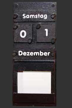 Noch kleiner ist dieser Kalender aus schwarz gebeizter MDF-Platte, bei dem die Folienbeschriftung fest in den mehrschichtigen Klarlack eingebettet ist. Dieser Kalender hat zudem noch ein äusserst praktisches Notiz-Zettelfach mit seitlicher Entnahmemöglichkeit für die handelsübliche Zettelgröße von 10 x 10 cm. Es können auch wichtige Informationen für den Tag in dem Sichtfenster deponiert werden. Das Zettelfach bietet auch Ablagefläche für ein Schreibgerät. |