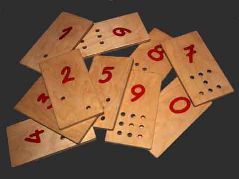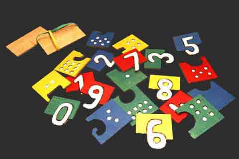 Die obere Partie der jeweils zweiteiligen Puzzletafeln zeigt die Zahl (0 bis 9), die untere die jeweiligen Mengenpunkte. Die Platten sind so geteilt, dass die Form nur bei der richtigen Kombination passt. Zahlen und Mengenpunkte sind fühlbar in das Kiefer-Sperrholz gefräst. Hier wurde farbiger Spielzeuglack und entsprechender Klarlack verwendet. |